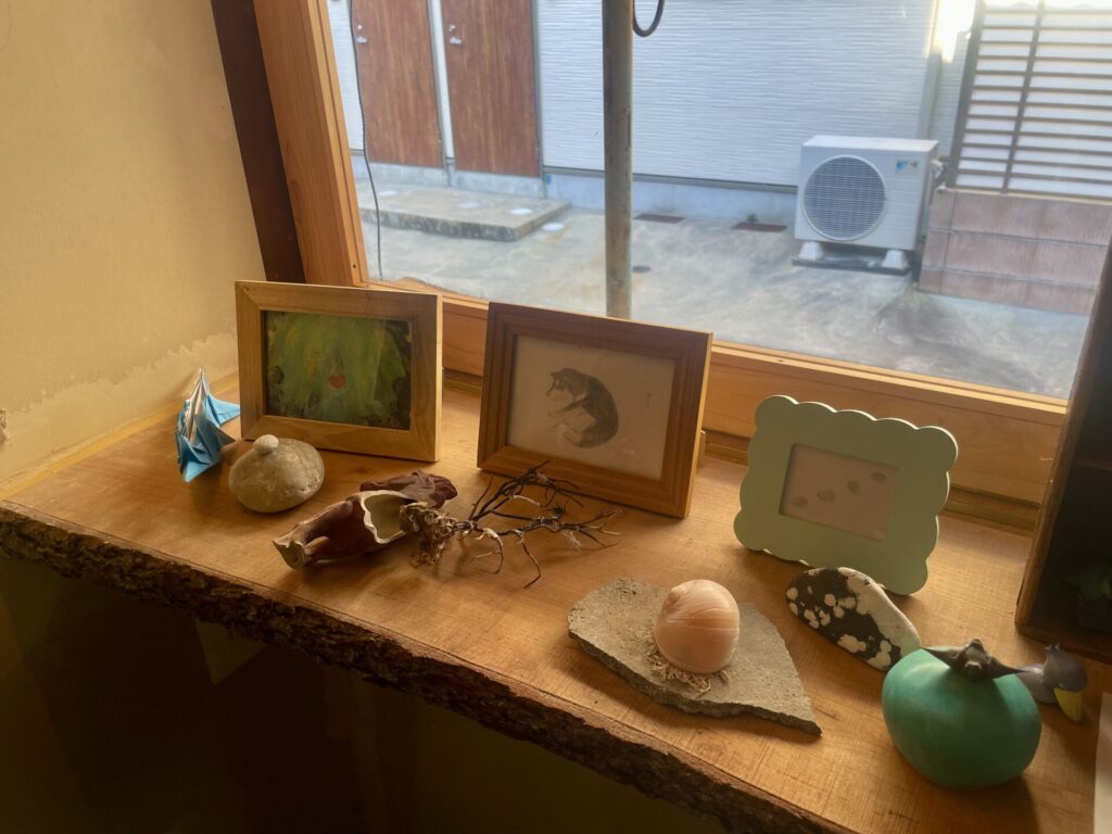 建物内では作品展示と共に、ゆったりくつろげるようにセッティングされたソファと音楽。やわらかなイラストや写真を、心穏やかに鑑賞することができました。長田で生活するアーティストの4人は、さまざまな表現手法を通じて、人と町が出会う交流の場を作っていこうとしているそう。この日在廊していたのは楠田はるきくん。まちのお母さんが教える料理教室なども開きたい、いずれは料理提供もできるようにしたいなど、お互いにこれからの話を交わしました。