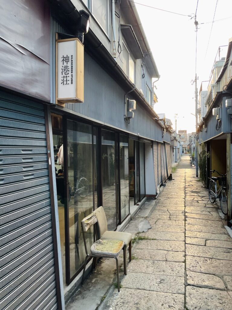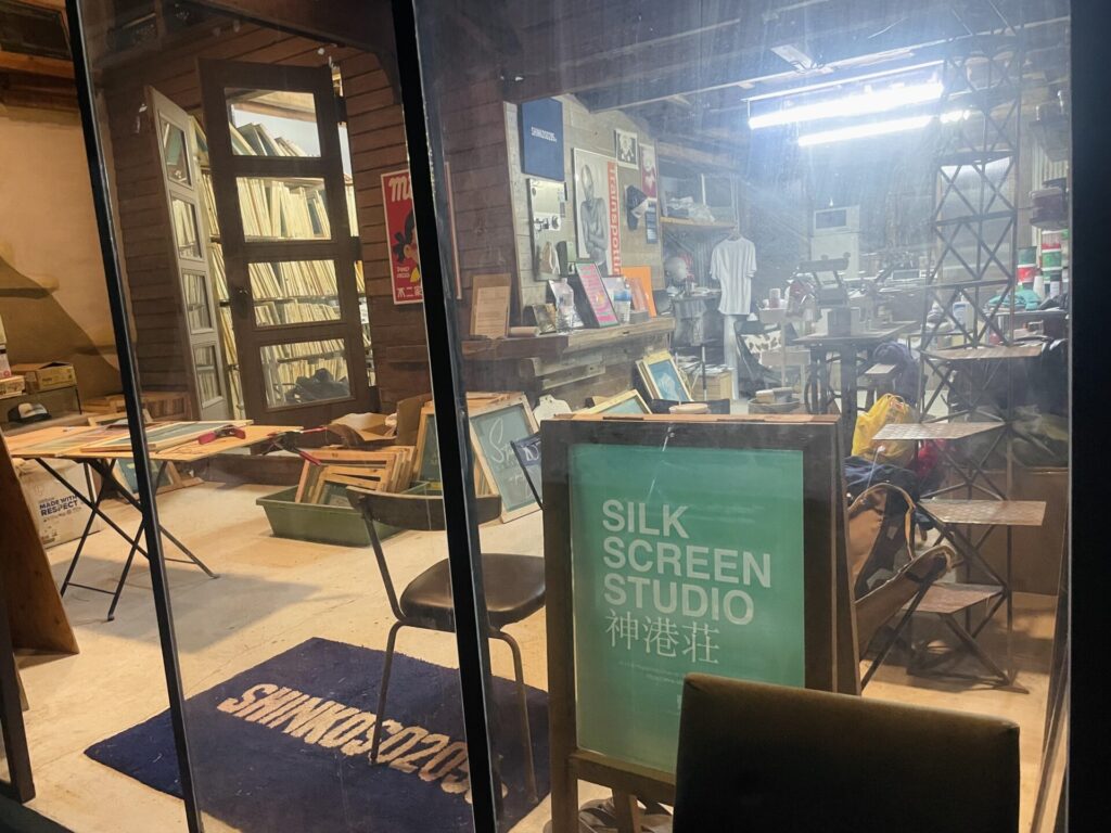元々は町の商店街であったのであろう、石畳の小道を進んだ先に、全面ガラス張りのおしゃれな空間が。ここは、アパレル制作やシルクスクリーン体験を行なっている「STUDIO 新港荘」さんのシルクスクリーンスタジオです。