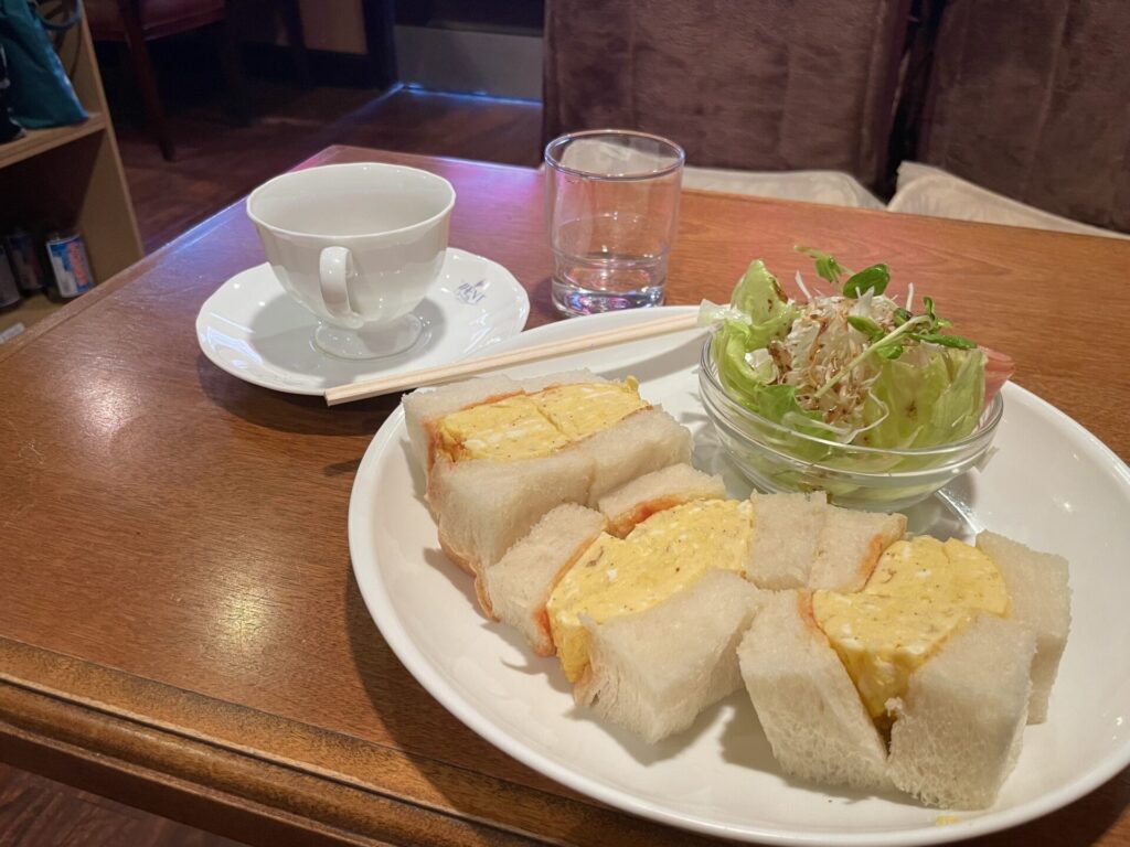この日はたまごサンドとコーヒーを注文。分厚いたまごをふわふわの食パンでサンドしたたまごサンドは、このお店の人気メニューだそうです。