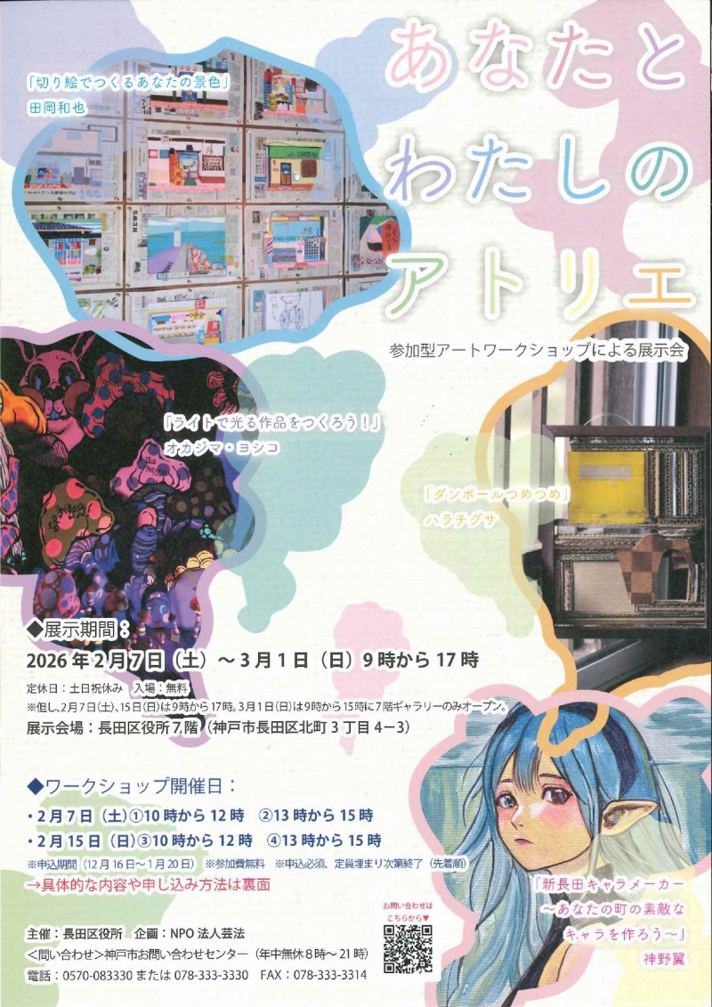 長田区役所7階ギャラリーにて、長田区にゆかりのあるアーティスト講師とワークショップ参加者の共同仮設アトリエを臨時開設します!