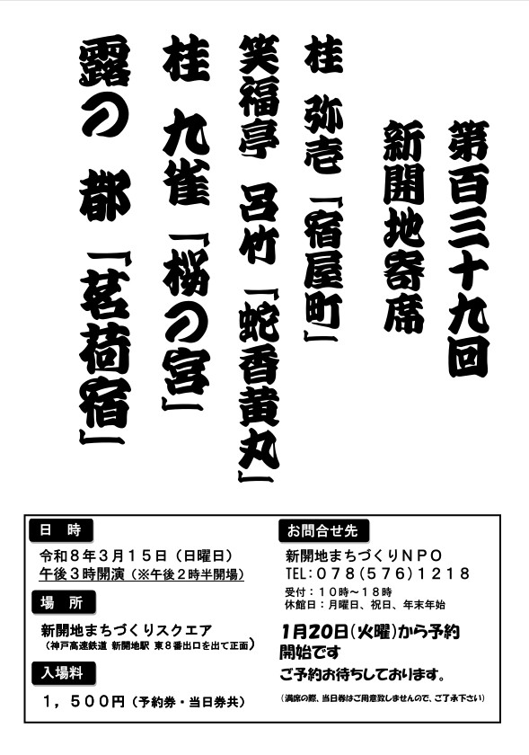 3月15日(日)第139回新開地寄席を開催いたします!