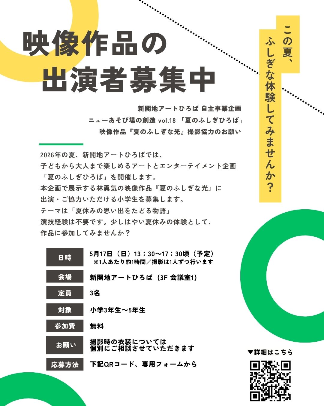本企画では、映像作家・林勇気による作品『夏のふしぎな光』に出演・ご協力いただける小学生を募集します。