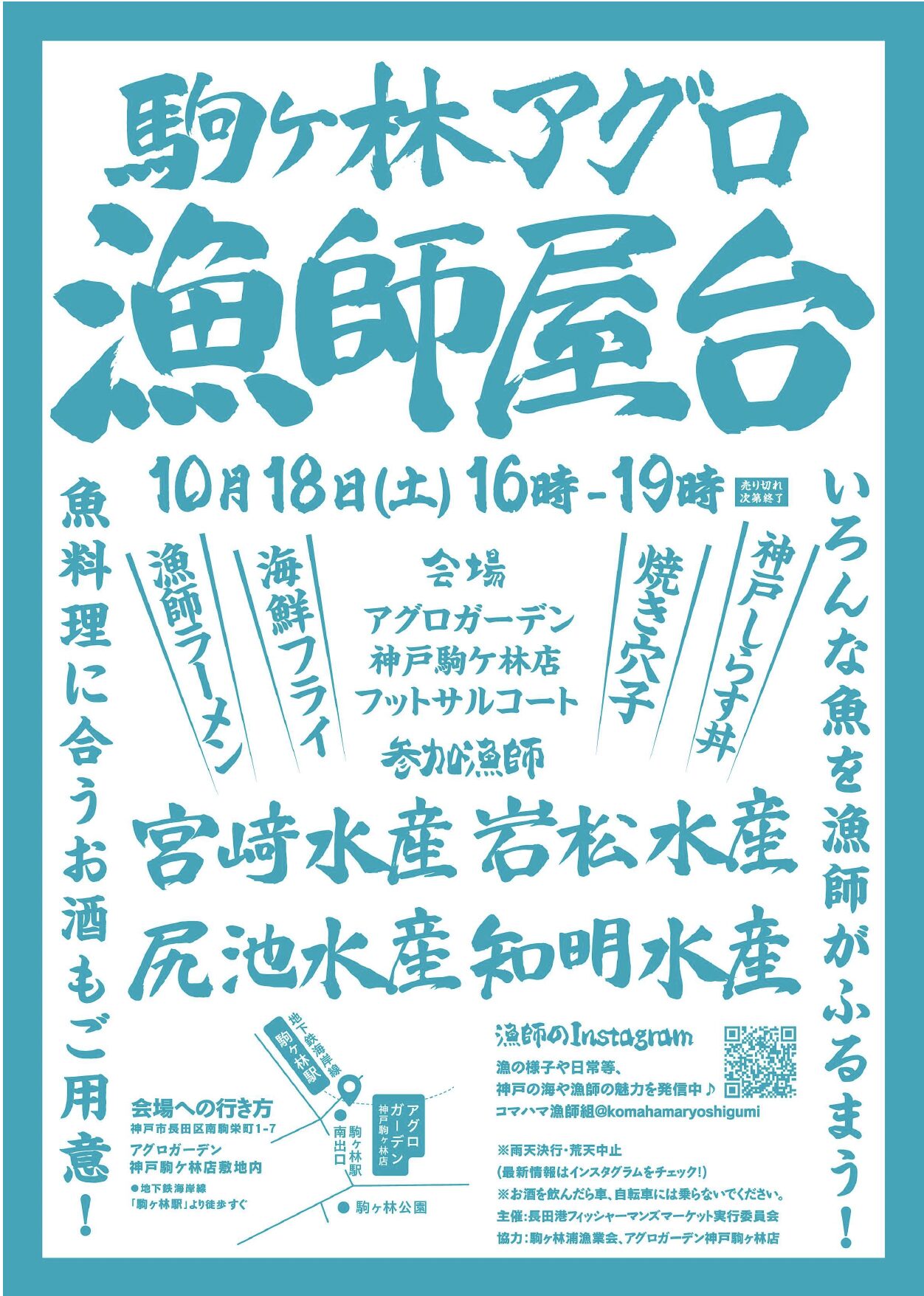 長田区南部の駒ヶ林では約40人の漁師が船を出し、約150年の歴史を誇る魚市場では、とれたての魚を目利きのプロたちが囲んで競りが行われています。 この度、魚のおいしさを知ってほしい、漁師や漁業を身近に感じてほしいという思いで「駒ヶ林アグロ漁師屋台」を開催します。アグロガーデンを会場に、漁師が「うまい!」と太鼓判を押す魚料理をふるまいます。海の幸を堪能しに是非お越しください。