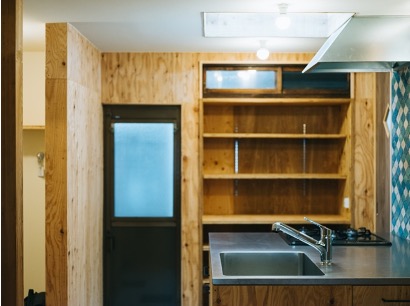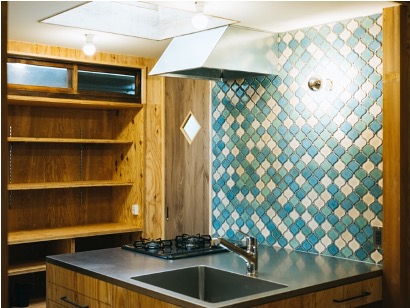 この特徴的なタイルはシタマチJr.女子工務店による施工。キッチン本体も壁面側から部屋の真ん中側に配置して、三方から使えるようにされています。キッチンを囲んで喋りながら料理ができる空間に。