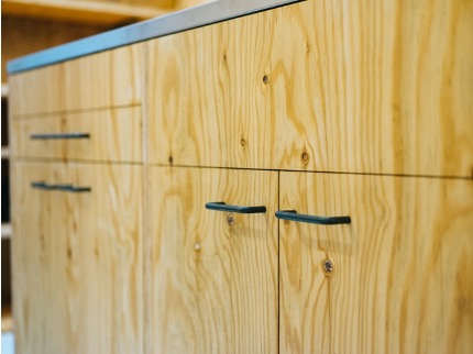 天井にあけられた天窓から自然光が入ってくる。そして、オリジナルで作られたこの什器本体は苅藻の家具屋さんMOUが、扉の取手はF:machineが作るなどシタマチネットワークが生かされているそう。