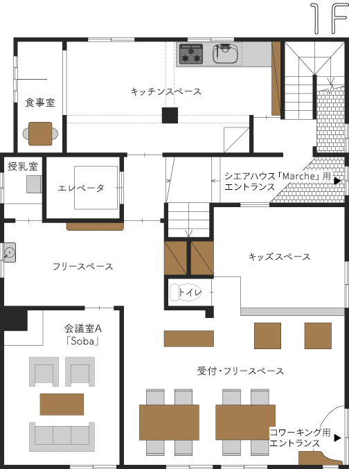 1階に入ると、受付・フリースペース・キッズスペースがあり、子どもが遊ぶ姿を見守りながら仕事をすることができる。2階には個室オフィスや、モニター・イス・キャビネットが設置された個室ブースなど、さまざまなワークスペースが設けられている。