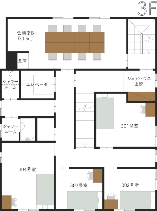 3階には貸し会議室が1室ある。3階の一部と4、5階は、シェアハウス「International Sharehouse Marche」のスペース。3階にあるシェアハウスの玄関は、オフィス利用者が使う階段とは別の階段で1階からつながっていて、居住空間のプライバシーを大切にしている。4階には、住人の共有スペースとしてリビングやキッチンがある。