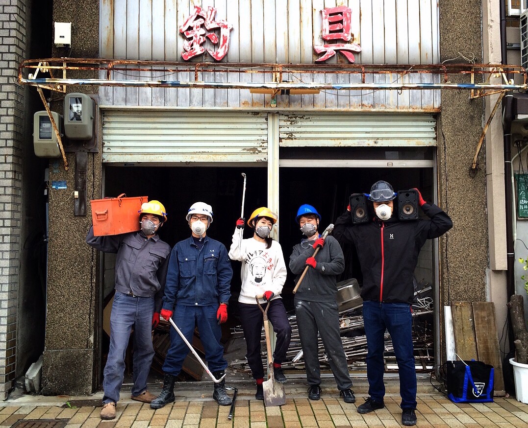 あととなりのビルヂングですが、もう釣具屋ではないけど、正面に掲げられた「釣具」の看板はしばらくそのままにしておきたいなあと思っています。この写真はその解体・改装チーム、名付けて“カルチア交芸団”です。後ろの「釣具」、ええ感じでしょ。