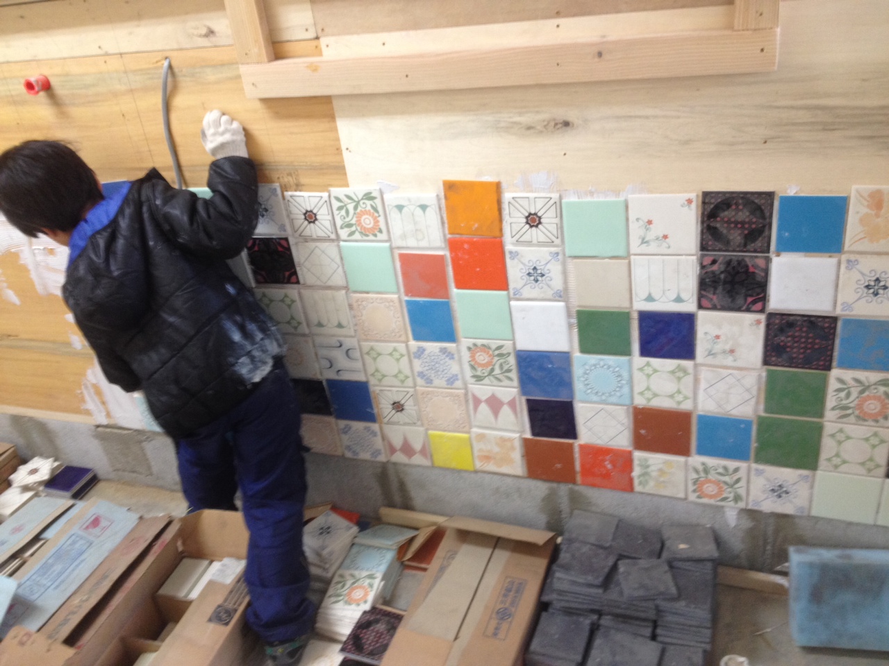 例えばテーブルや棚なんかも作ってみたら意外と上手くいったんで、調子づいてタイル貼ったりモルタル塗ったり。けっこうその場の勢いだったりするんですけど。友人の厚意で色んな種類のタイルを大量に入手できたんで、厨房内についてはタイルでかなり自由に遊んでます。息子に自由に貼らせたりして。
