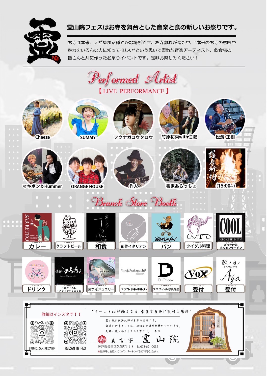 「信心0の人が1になるように」というのが私のお坊さんとしてのテーマです。私自身がそうだったので、仏教に興味がない人の背中を少し押してあげられたらと思っています。2023年4月に初めて開催した「霊山院FES」の参加者は、ほぼ信仰を持たない方々でした。チケットは130枚売れて、集まった人数はスタッフ含めて150人。6組のアーティストが出演して、書道パフォーマンスや飲食など9組の出店ブースもあって、とても楽しかったです。三宮にあるビアカフェ「ラフィン」で平成2年生まれの「02会」という同世代の集まりがあって、そこから広がった異業種の仲間たちにイベントの相談をすると「霊山院のためにできることがあるなら」と二つ返事でフェスに参加してくれました。あれだけの人数が集まりましたが終了後の会場はきれいで、両親もよろこんでいましたね。今年の4月28日に第2回の開催を予定しています。出店ブースが増えて、護摩祈祷もあって、住職も歌います。霊山院の和やかな雰囲気を感じてもらえればうれしいです。ラフィン店主のSomaくんや同世代の仲間のお店では、私が手づくりしている「お守り付き護摩木」を取り扱ってもらっていまして。お願い事が書かれた護摩木を受け取って、年末の護摩祈祷で焚いています。初めの年は18本でしたが、昨年末は270本になりました。お遍路にしても護摩リレーにしてもそうですが「まずはやってみよう」が自分のモットーですね。踏み出せば、いろんなものが動いて、いろんな人が支えてくれます。