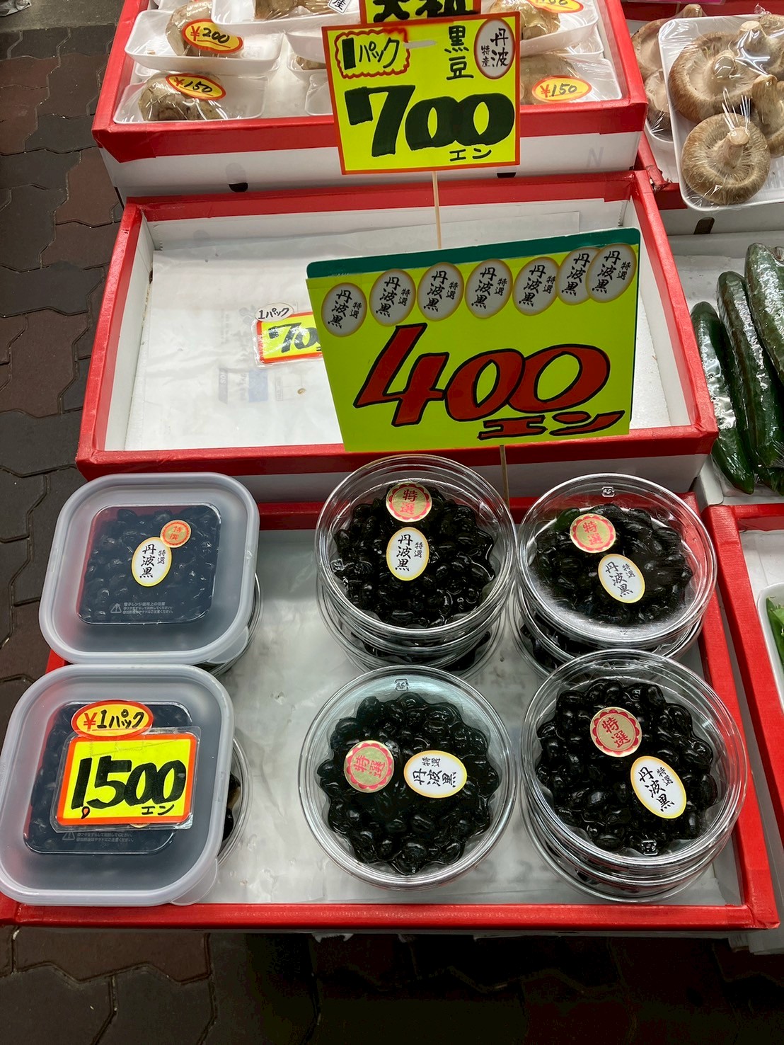 こわごわお店の方に聞いてみたら「ちょうど今裏でつめてるねん!」ということで、無事に700円のほうの特選の大粒黒豆をゲット。