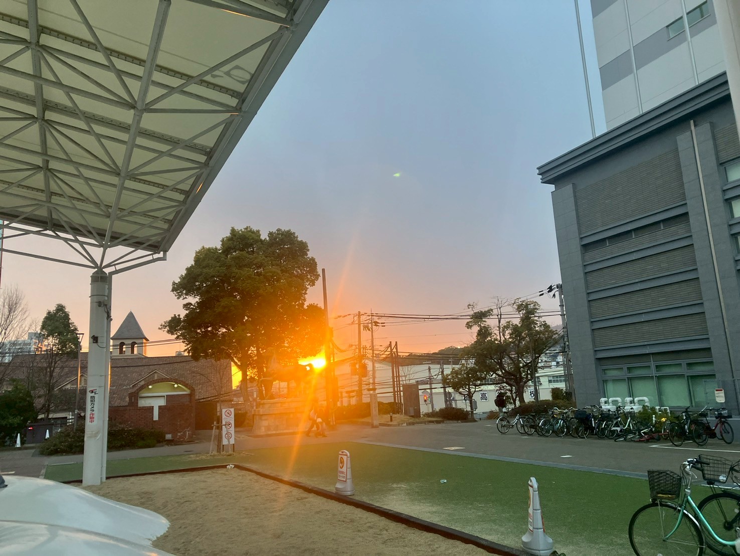 外に出たら、湊川公園の入り口にある、あるじを失ったお馬さんの像が美しく夕陽に照らされてたので、思わずパチリ。