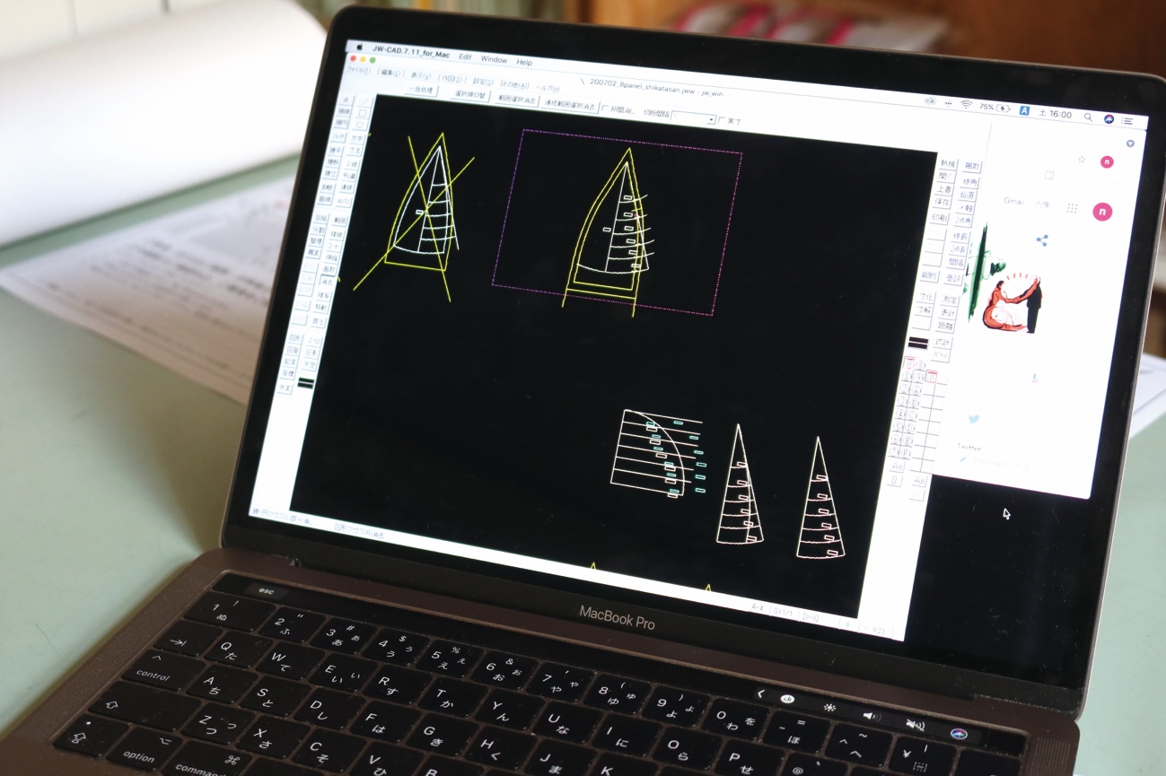 昨日も同じ作業をしていたのだけれど、なかなかシルエットが決まらない。なんどもCADで修正を加える。ちょっとした角度で驚くほどシルエットがかわるので慎重に慎重に。型紙をおこしたら生地を裁断して縫製。の繰り返し。見本にしているキャップと並べてうんうんとうなずく。あともう少し。