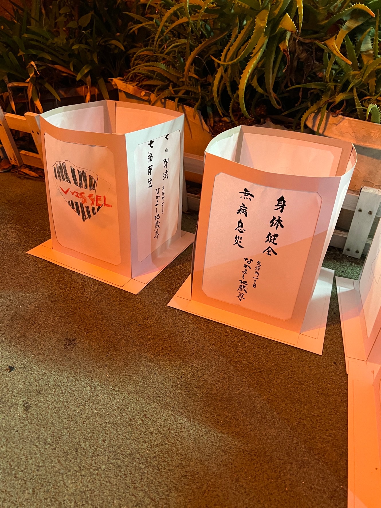 私の住んでいる町内には霊山院というお寺があり、そこには三体のお地蔵さんをお祀りしています。そのお地蔵さんを前日には町内の方々が協力して祭壇を組み子どもの名前の書いてある提灯をずらりと吊り、テントを立てお接待のお菓子を沢山用意して当日に備えるのです。