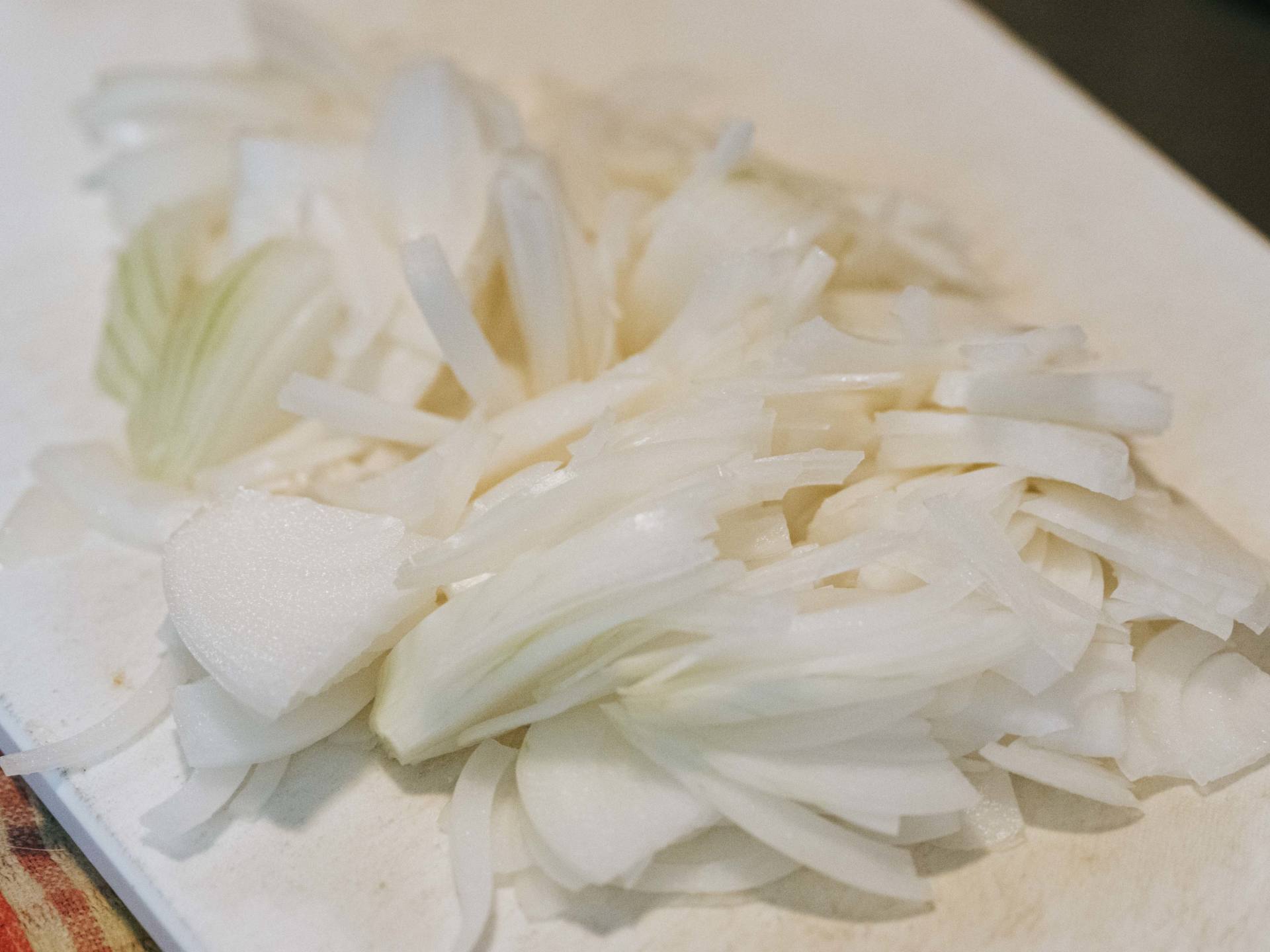 ニンニク、生姜の香りが立ってきたら、強火に切り替え、十字に切ってから千切りにした玉ねぎを入れます。ここで、塩をひとつかみ入れるのがポイント。これで玉ねぎの水分を出やすくして、炒めていきます。玉ねぎを焦がさないように注意しつつ、あまりかき混ぜないように。