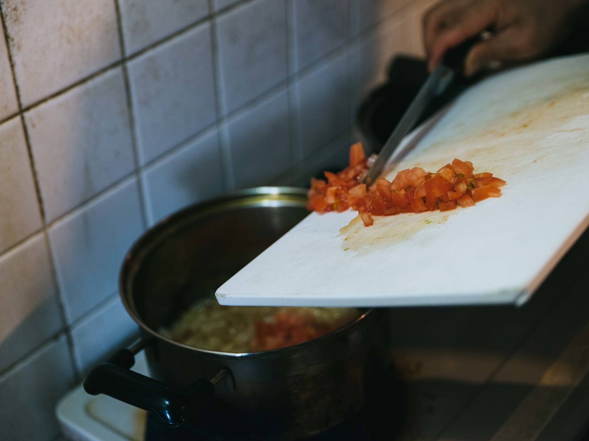 火を弱火と中火の間に弱め、1cm角に切ったトマトを鍋に入れます。トマトを潰すようにして炒めます。