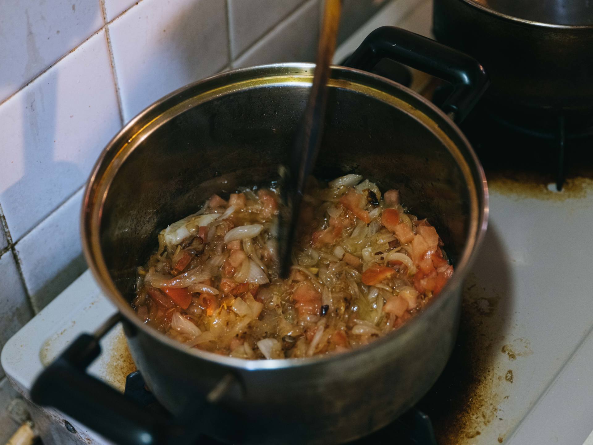 玉ねぎとトマトの水分が抜けるまで炒めて、旨味を凝縮させるのが美味しくするポイント。どこまで炒めるか、目安は簡単。写真のように、炒めている具を、混ぜているヘラの角を使って分けてみます。具が道のように分かれたら十分です。