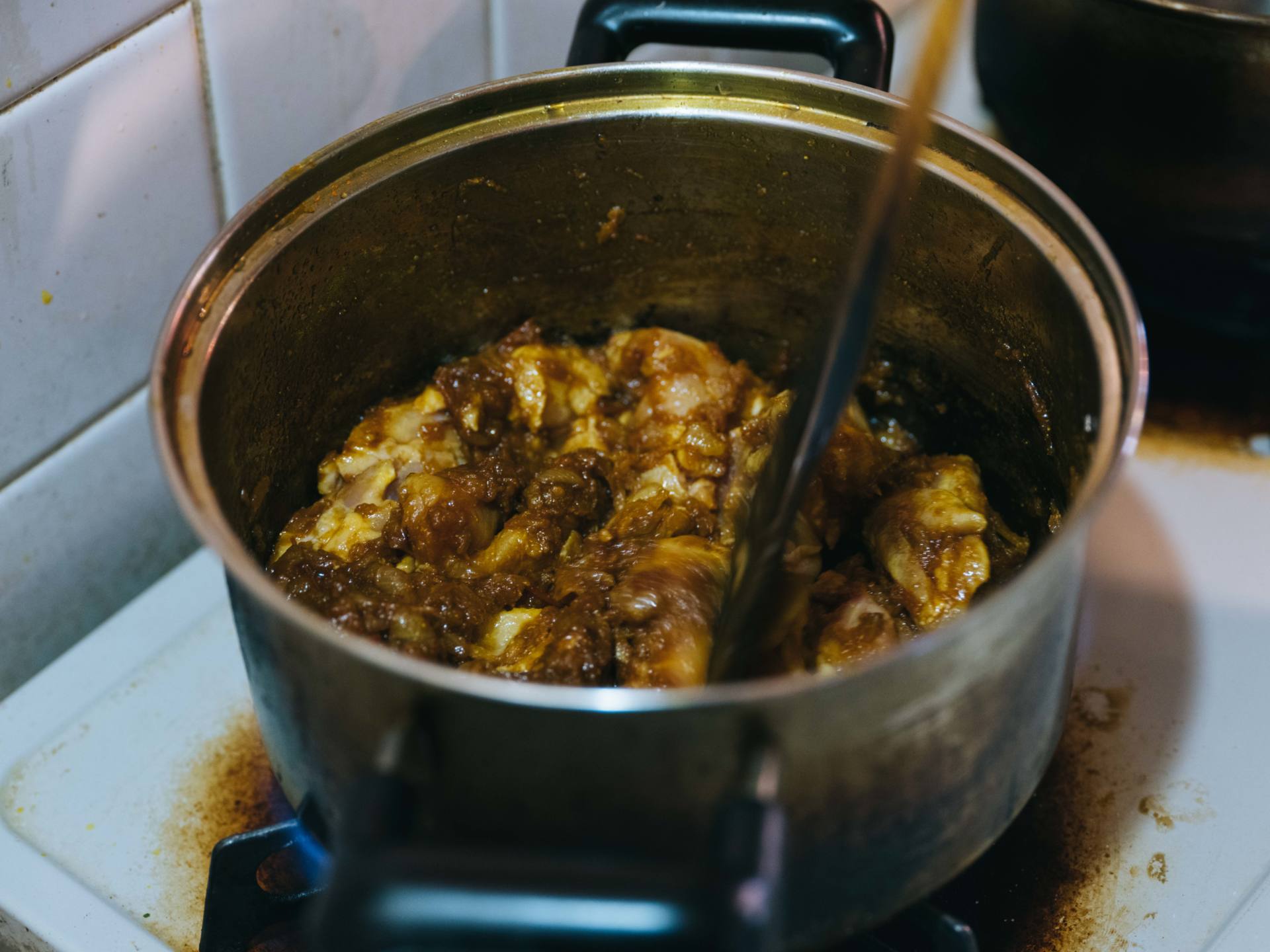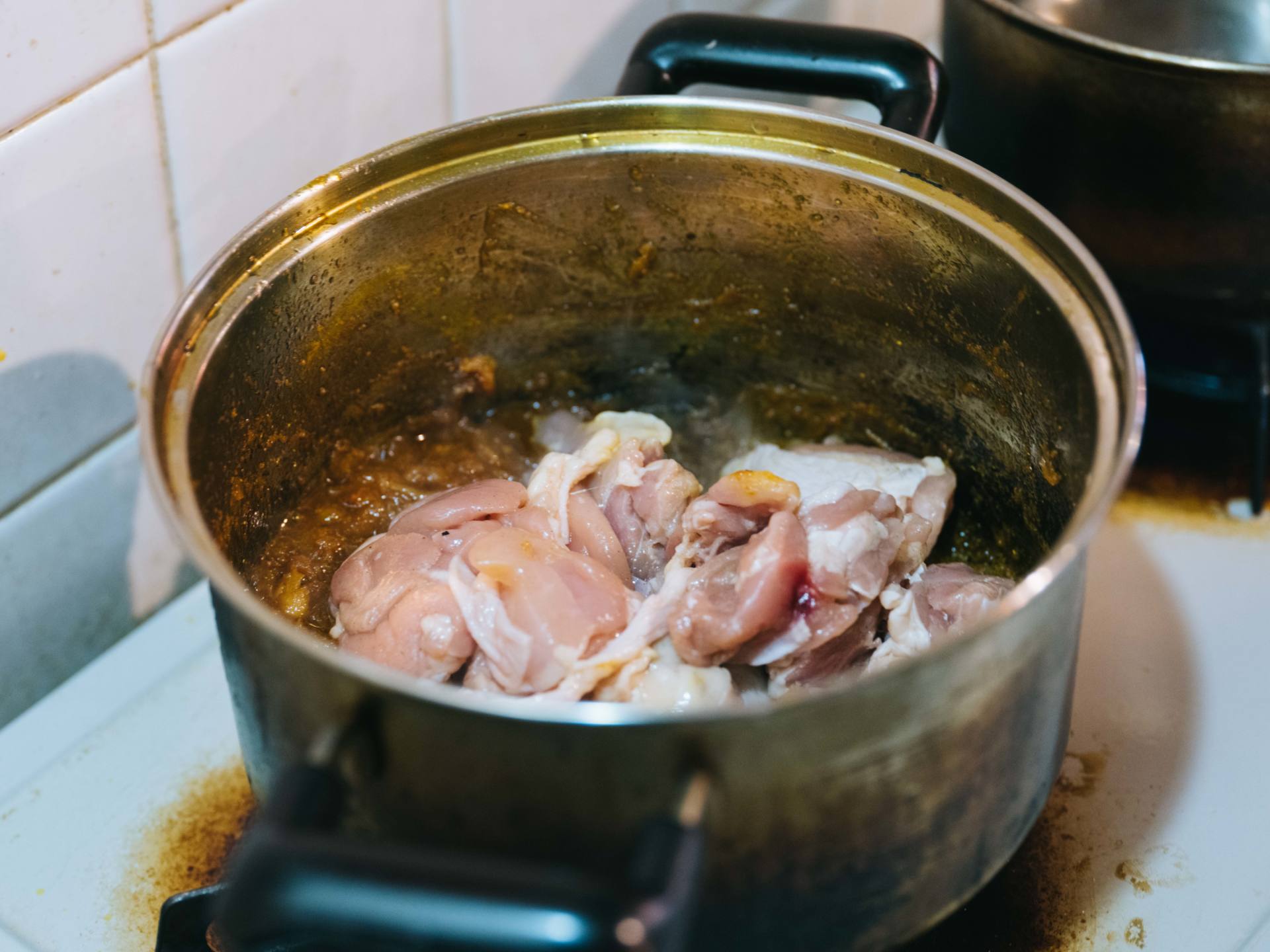 鶏肉の表面に焼き目がついたら、沸かしていた熱湯を入れて、20 〜30分間煮込みます。ここで水を入れてしまうと、旨味が逃げてしまうので、必ず熱湯を入れましょう。また、煮込みすぎても鶏肉の旨味が逃げてしまうのでご注意を。