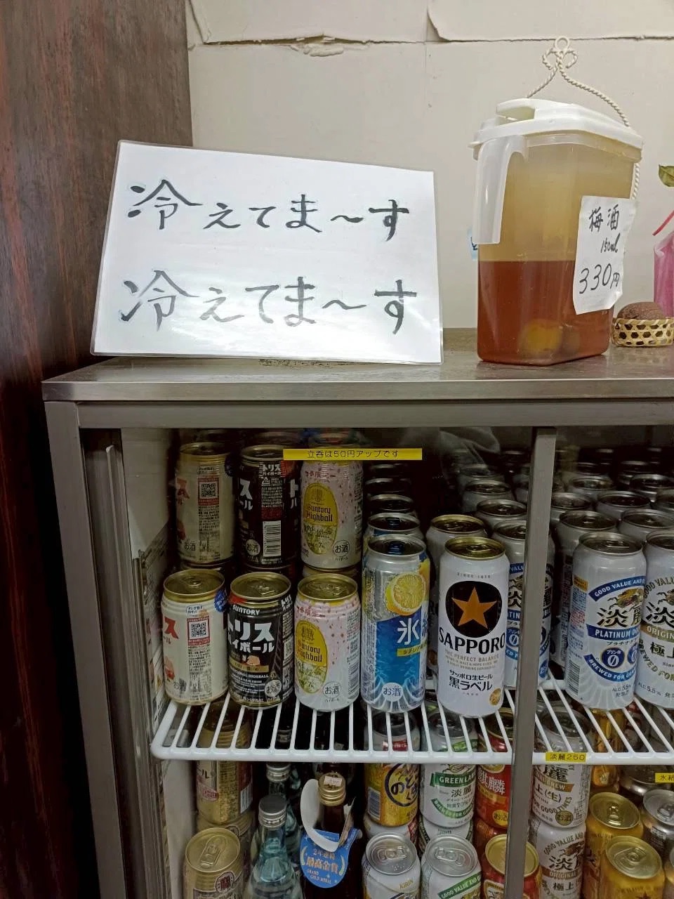 カウンターに並んだお惣菜たちを横目に店内へ。メニューはバリエーション豊富で、お酒はもちろん角打ちならではの激安価格。缶ビールやハイボールはたっぷり冷蔵庫で冷えているし、樽チューハイも置いてくれているのが嬉しい。
