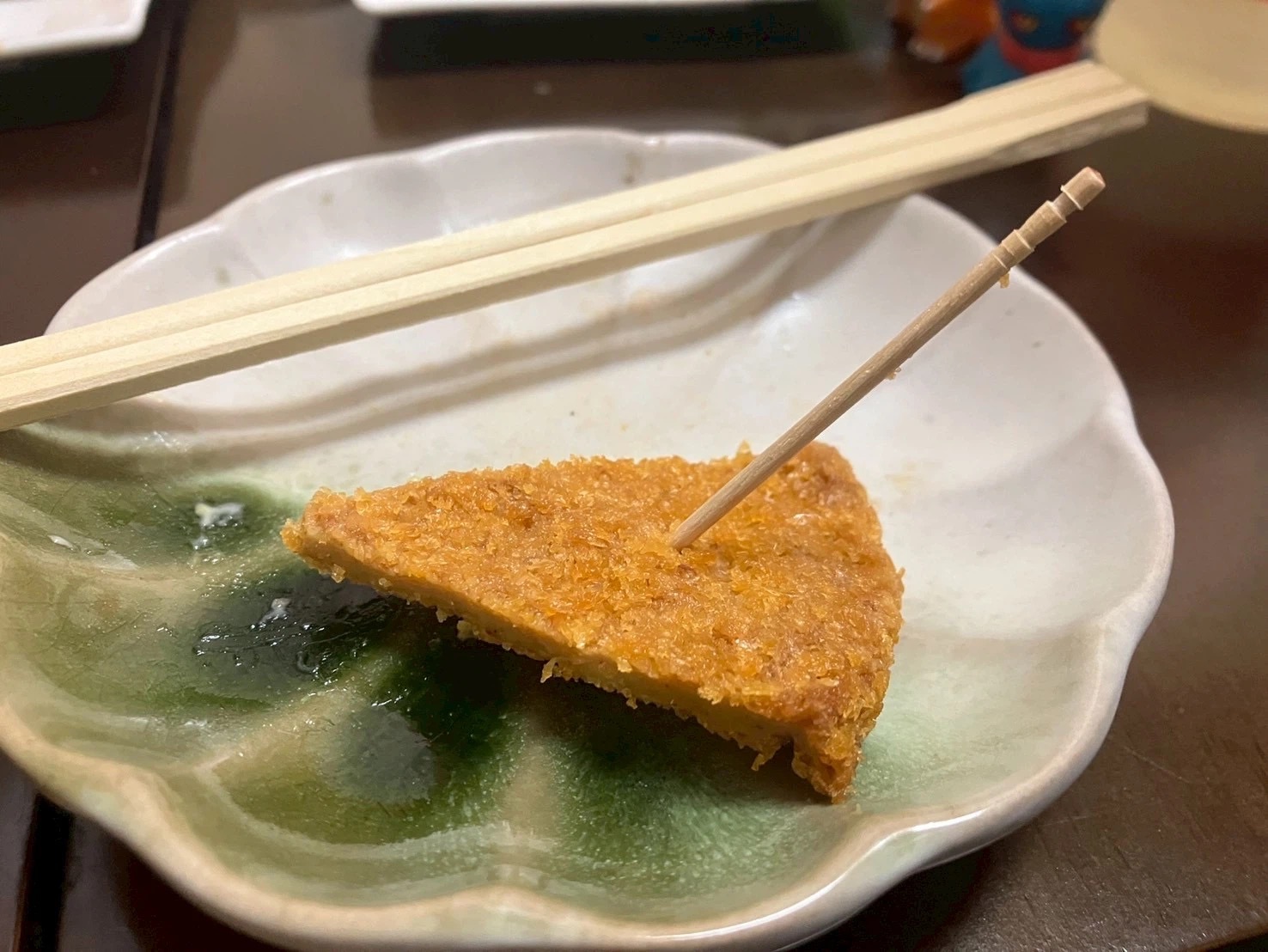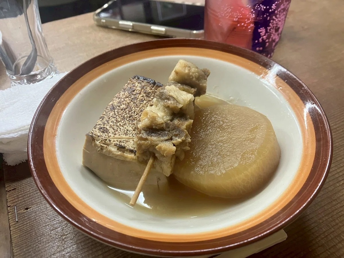 開店早々、つぎつぎと常連さんで埋まるテーブル。17時前にはもう満席となる。おかあさんが大皿に載ったカツみたいなものをつまようじにさして、一人一人に配ってくれた。頼んでないのに出てきたおつまみは、お客さんの旅のお土産だという。