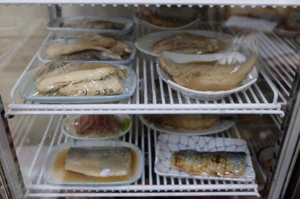 冷蔵ショーケースから自分でとるタイプのおかずもある。筑前煮と菜の花の和え物をとって、まずは乾杯。