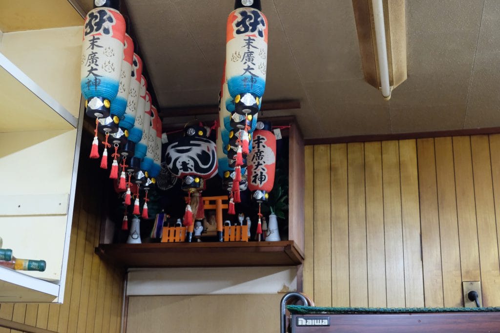 お稲荷さんの近くにお店があり、お店の中にもお稲荷さんがある。すごく歴史を感じる店内だ。それにしても、おでんのスジがむちゃくちゃ柔らかい。大根もとてもよく、しゅんどります。