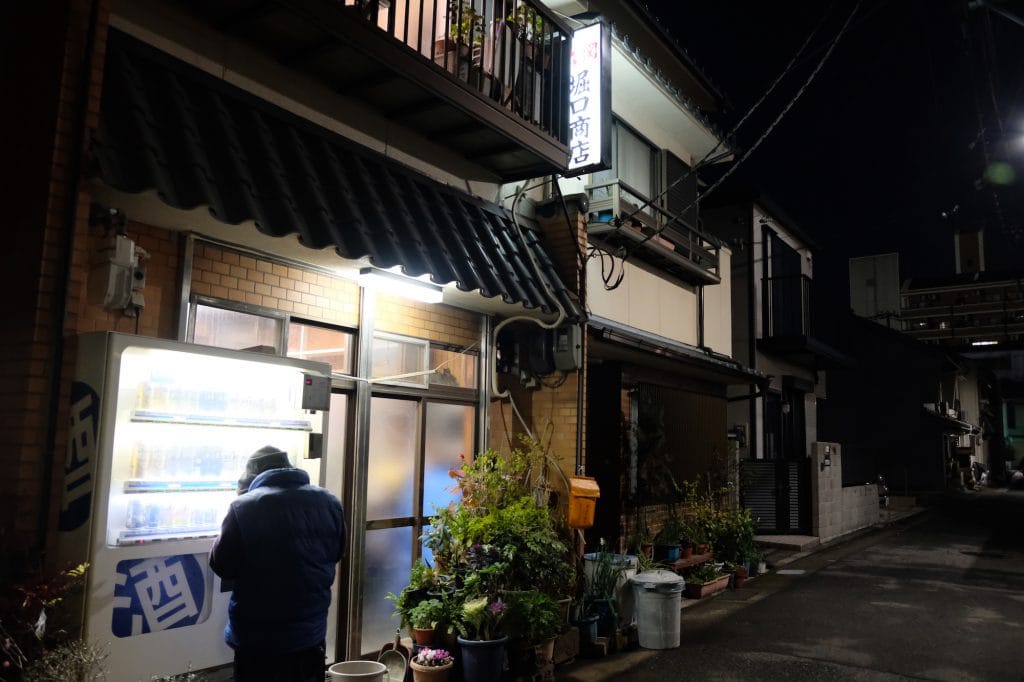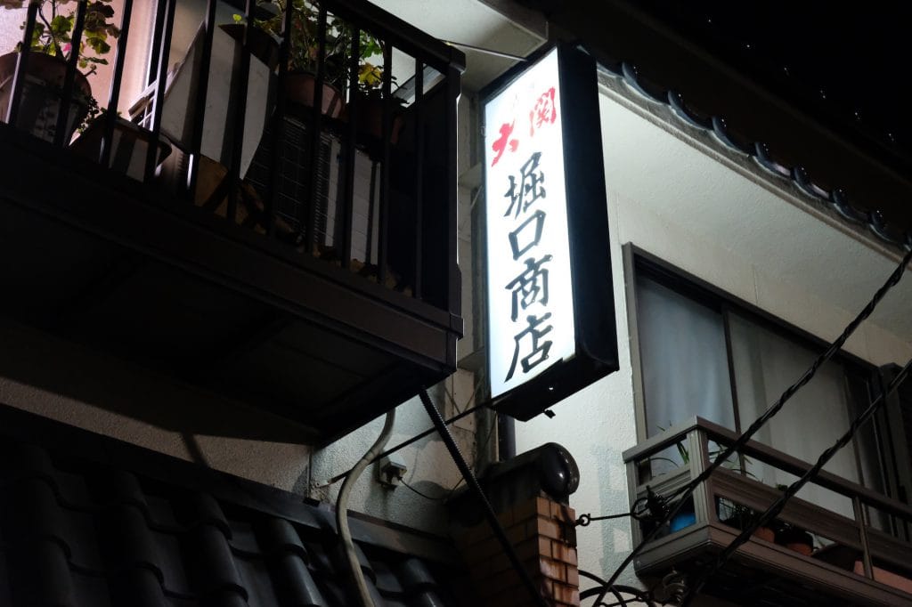 ちらっと、路地のスキマから、酒屋さんらしき光が見えた。ここは和田崎町、「堀口商店」と看板が出ている。