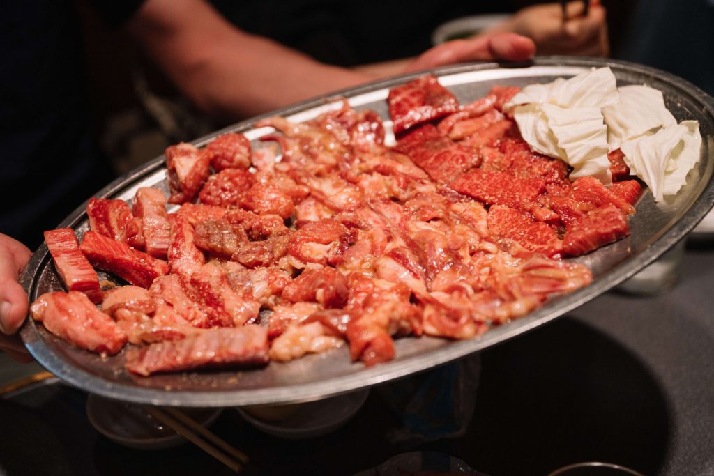 そこからまた歩いて国道2号線より一つ手前の路地を平行に歩きながら、「ここは押さえときましょう。多分、焼肉の概念変わるので」と言う取材ディレクターのカメラマンからオススメされた韓国系の焼肉屋に向かう。焼肉「牛車」。下町エリアなのにあまりお店の明かりがない中に、植物とネオンで交錯した光が鈍く反射し、如何にも異彩を放つお店がポツンとあった。もう夜も11時をを回ろうとして、駅からも遠い場所なのにほぼ満席に近い状態だった。