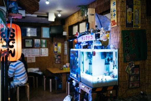 22時すぎ。家家の並びにある「ザ・うどん」へ。屋台で13年、こちらに移って7年という、地元では知られた店。大きな屋台を思わせるような店内は、この時間でもほとんどのテーブルがうまっていた。車で来ている地元民も多いようで、この感じ、どこかで見たような…とボヤけた頭を振り絞ってみると、いつかのアメリカ映画で見たロードサイドのダイナーの雰囲気だ。クリスマスみたいな電飾、金魚やチンアナゴが泳ぐ大きな水槽、大衆演劇の伍代孝雄ポスター、店主の首もとをはじめ店のあちこちで目にする黄色いタオルなど、その雑多さにも不思議な統一感がある。名物の油かすうどんやカレーうどんの他にも、おでん、きむち、スジャータのソフトクリームまで。ビールとともにご機嫌に食べていたはずが、気づけば少し眠っていた。
