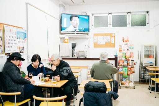 23時前。銭湯「萬歳湯」へ。こちら、靴脱ぎから暖簾をくぐって脱衣所にいたるまでの待合いを広くとって、街の応接間としての役割も果たしている。乾き物や極細プリッツ、ビールにおでんも煮えている。くつろぐみんなが視線をやる先には大きなテレビ。ちょうどこの日、平昌オリンピックの女子フィギュアに坂本花織選手が出場。野田高校に通う地元の女子高生とあって、「しっかりしてる」「彼女はポーアイで練習しとる」なんて勝手なこと言いながら、大勢で見るともなく見るテレビがいちばん楽しい。ビールも進む。キリのいいところで「ではお先に」と帰ってく人、お風呂に入る人。こういう場所にあるテレビはほんといい仕事をする。あいにく酔いすぎなのと終電の時間もあったので、入浴することはできなかったが、ここで風呂とビールから飲み歩きをスタートさせるのもよさそうだ。