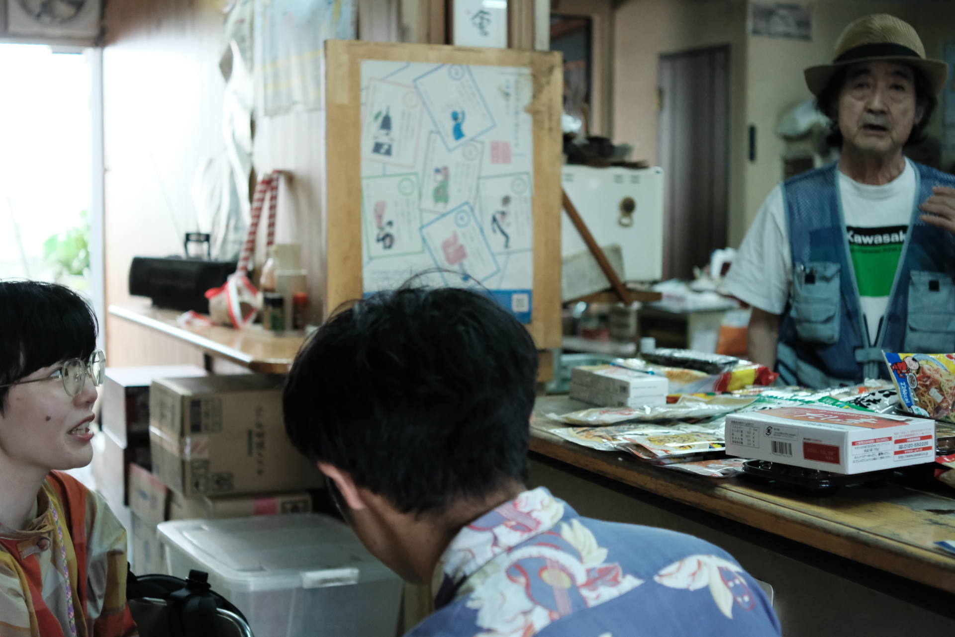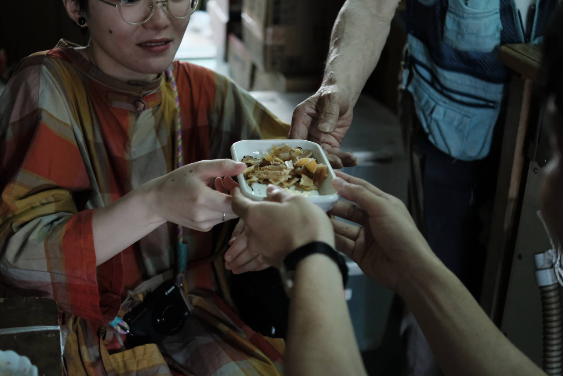角打ちだけど生ビールがある!ということで、早速注文。カンパイ! 明るいうちからビール、最高。アテはメニューにはなかった煮豚。ほどよく食感の残る脂とビールが合う合う。あーおいし。つぎは乾物を。蓋が赤いプラスチックの箱から出してすぐに炙ってくれました。ええ匂い。ここは長いんですか?と聞くと「13歳のときからやからー…」。…衝撃。どういうこと??詳しく聞くと13歳から叔母のお店を手伝うようになったとのこと。炭(練炭)や氷などを生業として商売しているうちに酒類の免許も取得。いまは酒店として営業している。だから歴史も長い。今年で95年ぐらい。現店主は3代目、御年70歳!