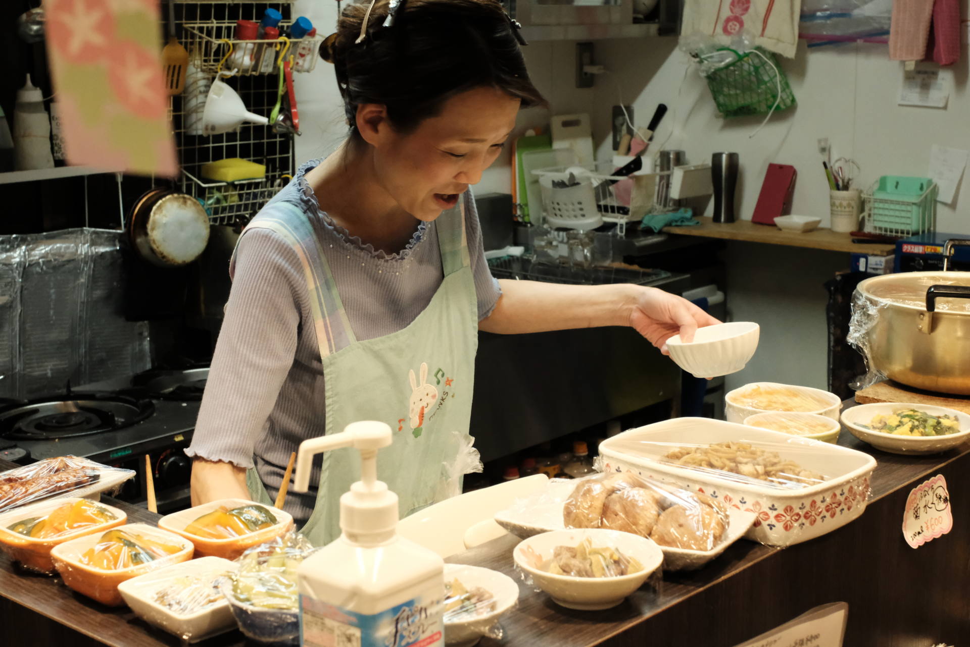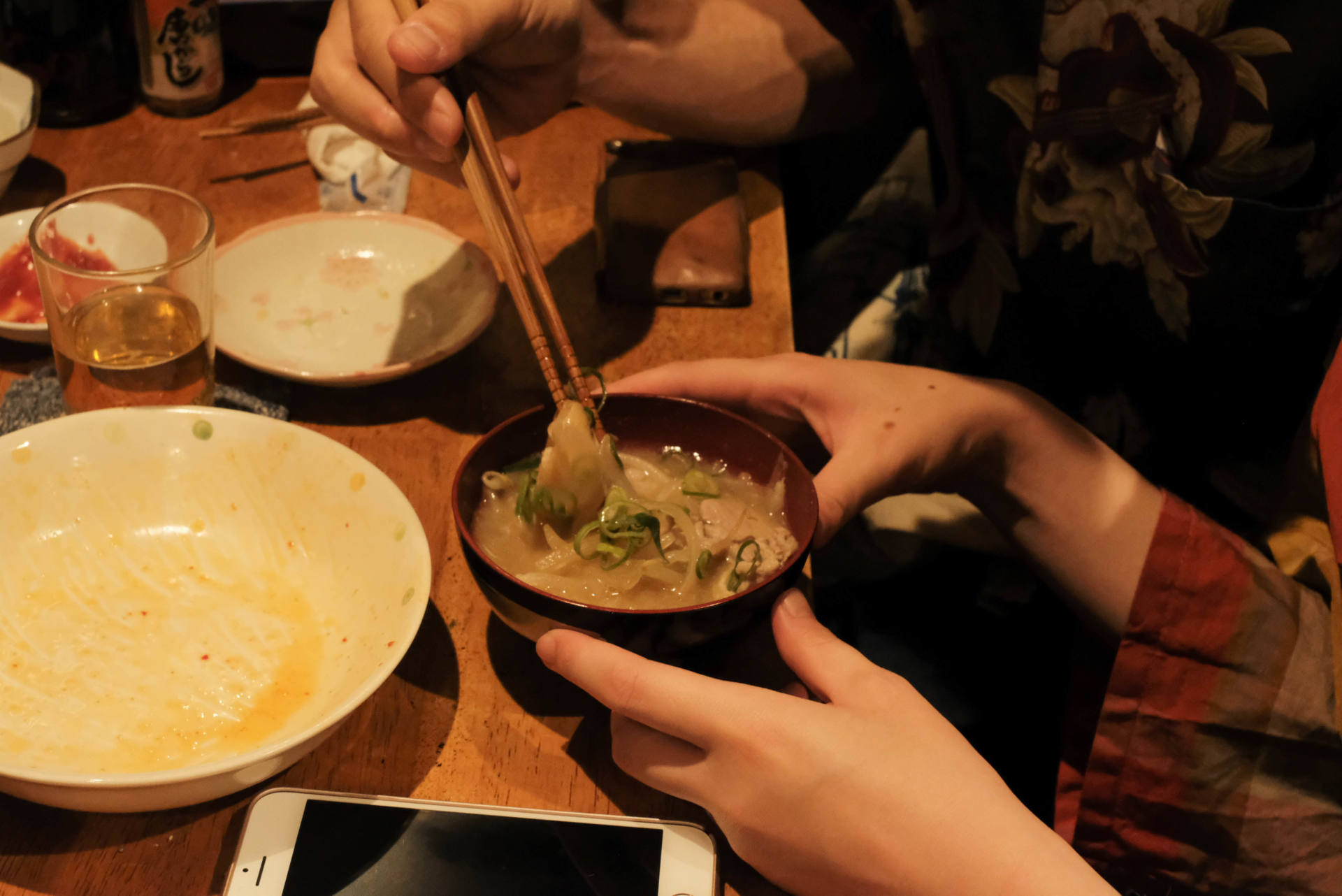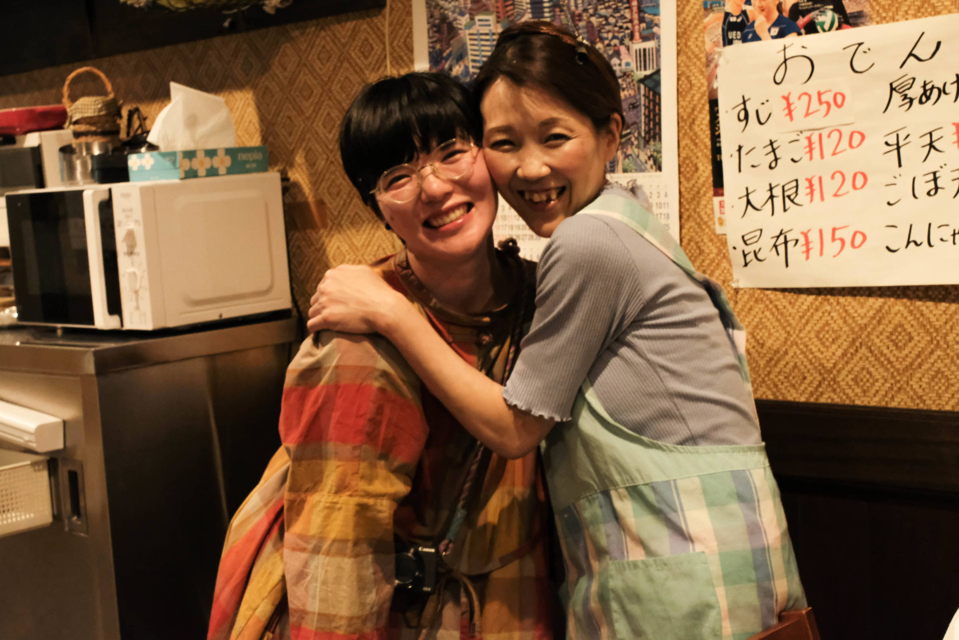 ついた場所は扇港湯の近くの「にし川」さん。ちょこんと小さいカウンターにお惣菜が並ぶ居酒屋。実はここ、六間道商店街にお店を構えていた「日の出食堂」さんが閉店したことをきっかけに、そこの娘さんたちがはじめたお店なのだそう。だからなのか?ザ・居酒屋!なメニューもあれば、おふくろの味!なメニューもある。どれもおいしい!豚汁はコショウが効いていてとくに好き!!