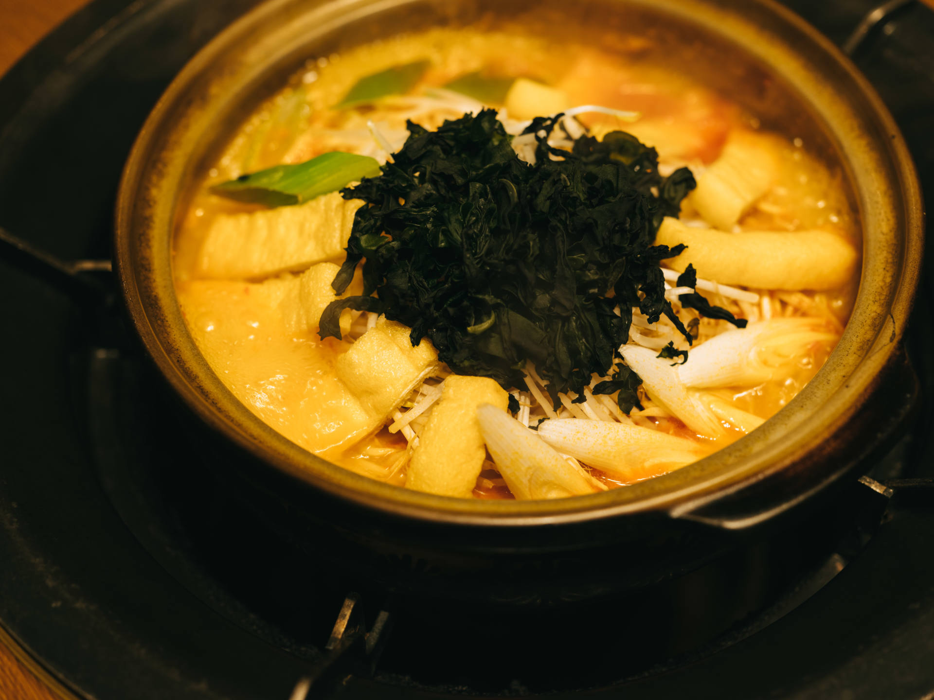 もやし、キャベツ、白ネギ、薄揚げなどの具沢山な山を包み込むようにスープがグツグツと煮えている。